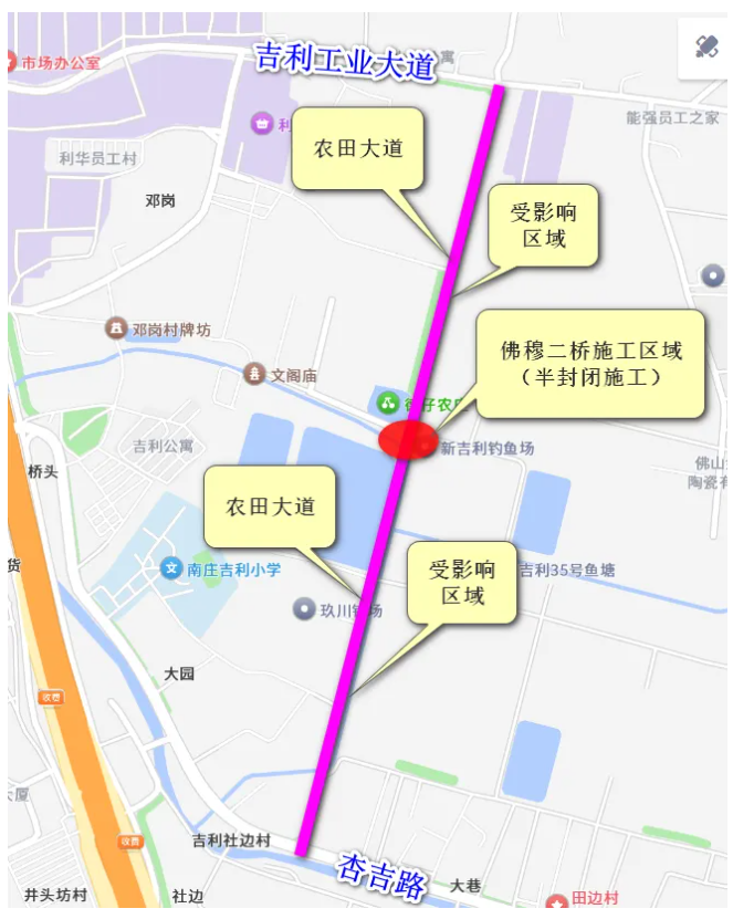 佛穆二桥位于佛山市禅城区南庄镇贺社线上,于2025年11月16日开始进行半封闭施工,施工期间桥面宽度2.8米,施工时间为2025年11月16日至2025年11月29日,施工期间桥面宽度较窄,仅供行人、电动自行车及小型汽车通行,通行时请减速慢行,注意安全,大型车辆请绕道行驶。造成不便之处,敬请谅解。