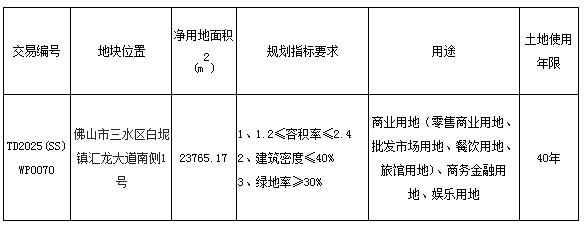 五、有意参与竞买者可于2025年11月14日后登录网上交易系统下载TD2025(SS)WP0070地块的《佛山市三水区国有建设用地使用权网上拍卖出让文件》。