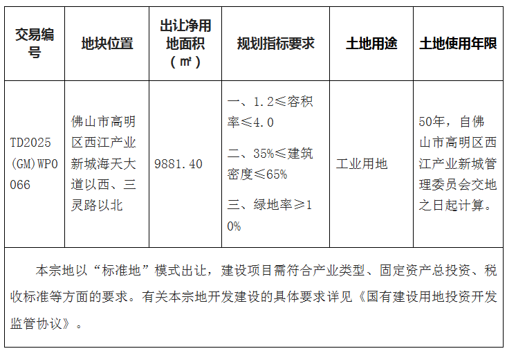 佛山市高明区西江产业新城海天大道以西、三灵路以北网上拍卖出让