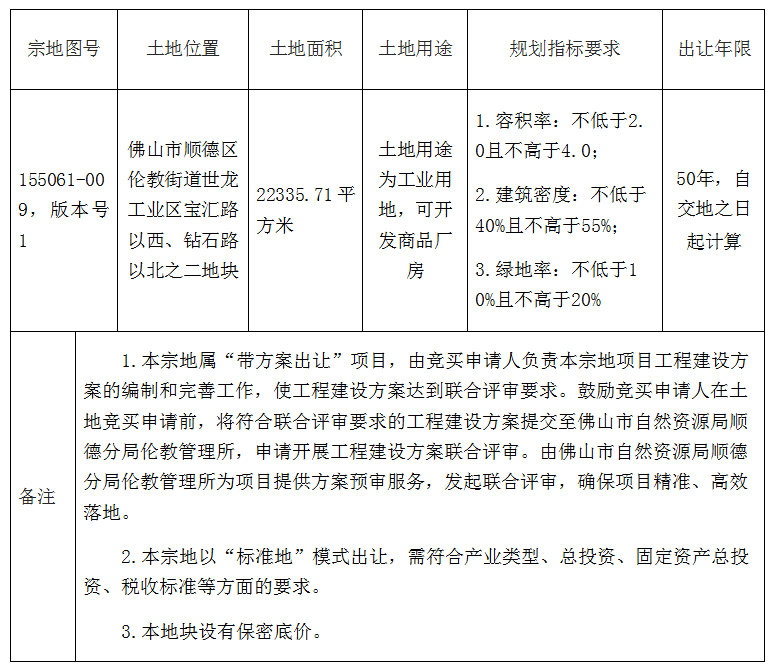 佛山市顺德区伦教街道世龙工业区宝汇路以西、钻石路以北之二地块挂牌出让
