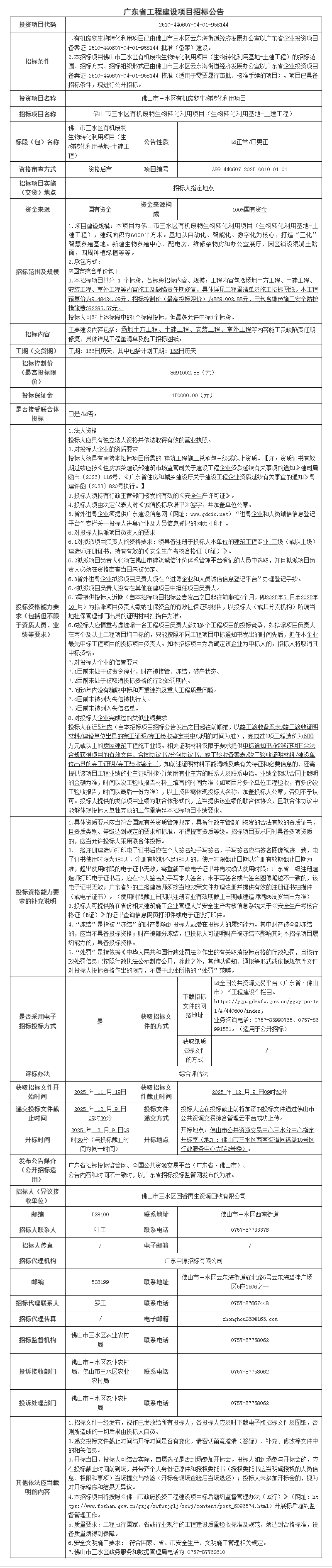 佛山市三水区有机废物生物转化利用项目(生物转化利用基地-土建工程)招标公告