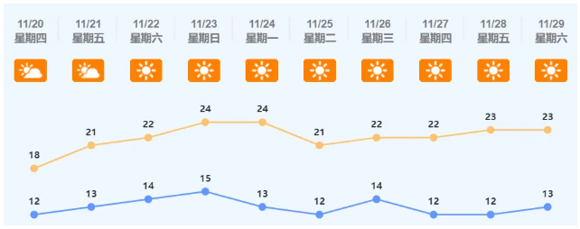 11月22日至23日,晴朗干燥,气温分别逐日升至14℃~22℃、15℃~24℃;