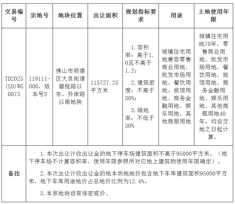 交易编号:TD2025(SD)WG0074;宗地图号:197082-505,版本号1;地块位置:佛山市顺德区陈村镇景成路以东、缤纷一路以南地块;土地面积:69139.61平方米,根据顺规条件(2025)0869号《佛山市顺德区建设用地规划条件》的分区,各分区的用地面积和规划指标详见下表: