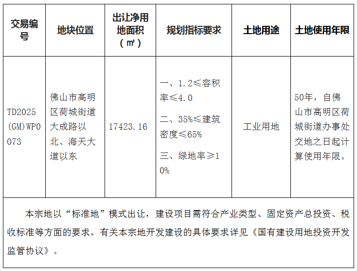 本块地其他规划建设要求按《高明区土地使用规划条件》(佛规明设函〔2025〕0115号)执行。