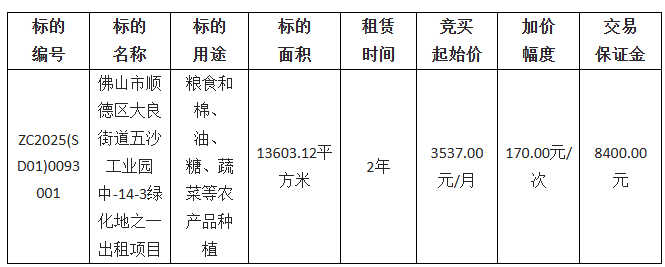 佛山市顺德区大良德良物业管理公司采用网上竞价方式出租位于佛山市顺德区大良街道五沙工业园中-14-3绿化地之一,欢迎符合资格的竞买人参与竞价。