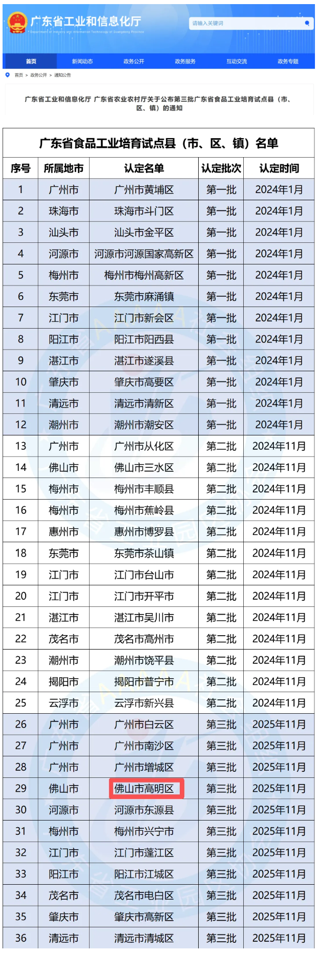 11月21日,省工业和信息化厅公布第三批广东省食品工业培育试点县(市、区、镇)。根据通知内容,经以前名单公示,确定广州市白云区等11个县(市、区、镇)为第三批广东省食品工业培育试点县(市、区、镇)。其中,佛山高明榜上有名。这一认可标志着高明区食品工业的发展迈入新阶段,利于进一步发挥区域特色优势,提升产业竞争力。