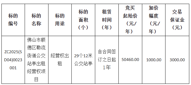 概述:佛山市楷德立项目管理咨询有限公司(代理机构)受出租方(佛山市顺德区勒流街道综合行政执法队)委托采用网上竞价方式出租位于顺德区勒流街道办事处的29个12米公交站亭使用权......
