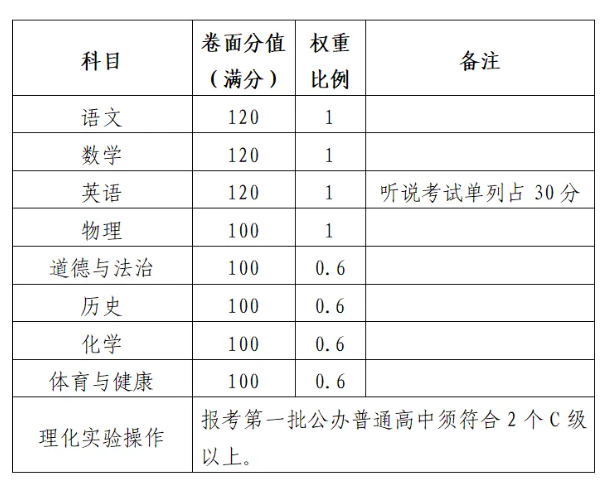 基于省改革文件要求,化学是录取计分科目之一,同时根据国家课程标准规定的课时和课程容量,化学仅学一年,可适当降低比重,以减轻考生负担。从2027年起,化学科按卷面分值60%折算计入总分,单科满分由100分调整至60分,调整后其比重与广州、深圳、东莞等地在录取中的比重大体相当(8%至9%之间)。生物学实验操作考试等级不作为录取依据。其他科目构成和折算方法不变,总分由740分调整至700分。提升了语数英等科目在总分中的占比。