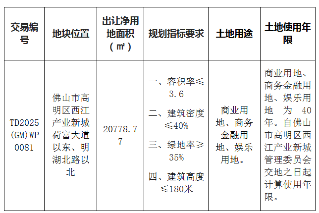 五、有意参与竞买者可于2025年12月1日后登录网上交易系统下载该地块的《佛山市高明区国有建设用地使用权网上拍卖出让文件》。
