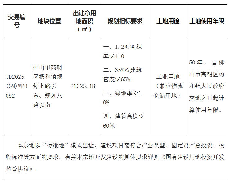 本块地其他规划建设要求按《高明区土地使用规划条件》(佛规明设函〔2025〕0112号)执行。