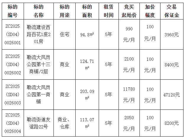 1.本项目各标的交易保证金为人民币:勒流建设西路百花1座201房的交易保证金为大写:叁仟玖佰陆拾元整(小写:¥3960);勒流大凤岗公园第十三商铺/2层的交易保证金为大写:捌仟肆佰元整(小写:¥8400);勒流大凤岗公园第一商铺的交易保证金为大写:肆万柒仟壹佰贰拾元整(小写:¥47120);勒流街道友谊路22号的交易保证金为大写:捌仟贰佰元整(小写:¥8200)。