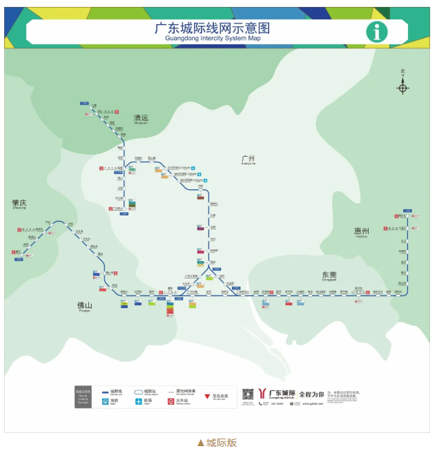 其中洲心站、花都站、鼎湖东站、番禺站、常平东站、小金口站等6个与国铁同站换乘但非同名的城际车站,同步标注了对应的国铁车站;