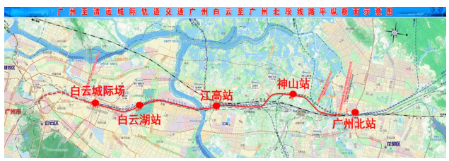 位于广州白云区、花都区境内,正线全长22公里,线路自广州白云站引出,经广州江高至广州北站,设广州白云站城际场、白云湖站、江高站、神山站4座车站,设计行车速度160公里/小时。