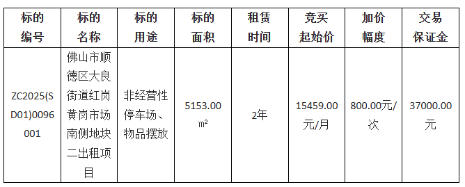 佛山市顺德区景良投资发展有限公司采用网上竞价方式出租位于佛山市顺德区大良街道红岗黄岗市场南侧地块二,欢迎符合资格的竞买人参与竞价。