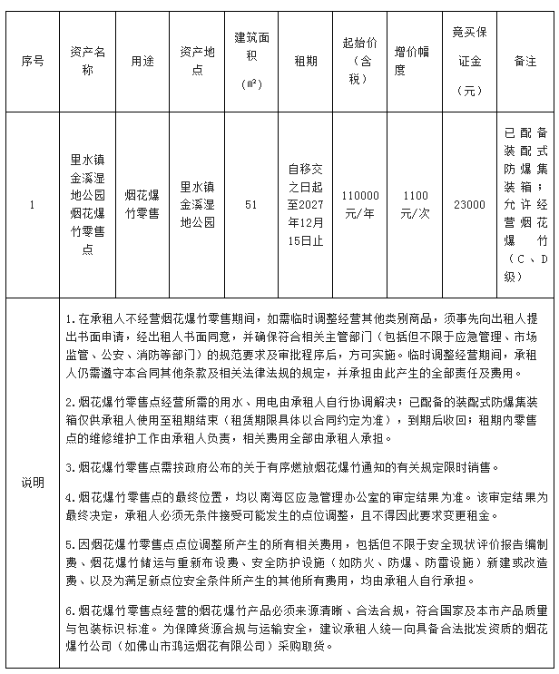 4.2026-2027年度里水镇共有3个烟花爆竹零售点的对外出租,即夏塘路烟花爆竹零售点、金溪湿地公园烟花爆竹零售点以及宏宇天御江畔与万科里之间的道路旁烟花爆竹零售点。意向人可同时报名参与一个或多个标的竞投,本次竞投允许多投多中,即符合资质的意向人可同时报名参与一个或多个标的竞投,且中标数量不受限制;意向人在竞得任一标的后,仍可继续参与后续所有标的竞价,并有机会获得多个甚至全部标的,但须独立承担每个中标标的相应的资金、履约及经营责任。