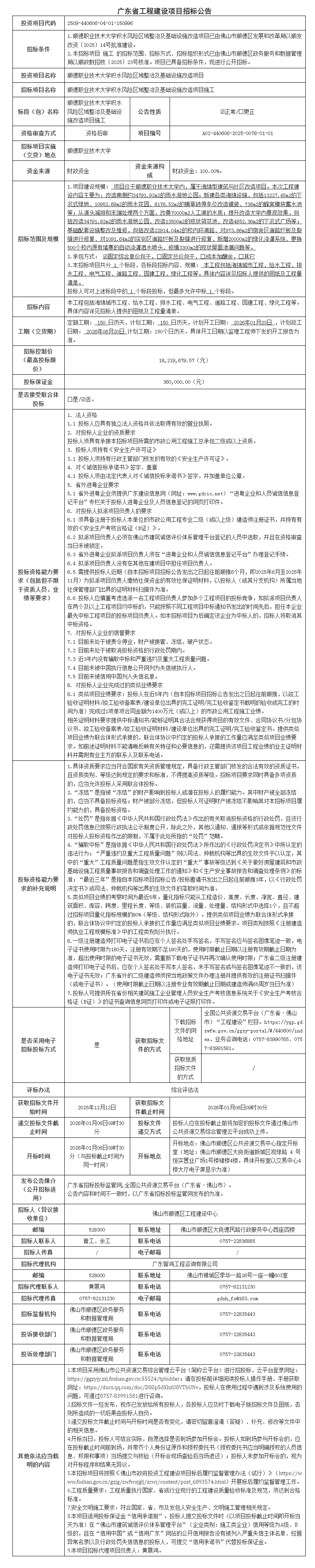 顺德职业技术大学积水风险区域整治及基础设施改造项目施工招标公告