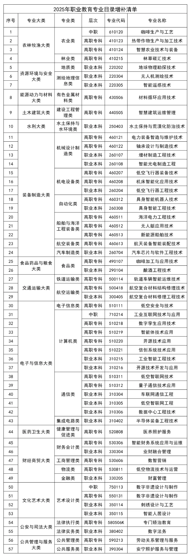 近日,教育部发布《教育部办公厅关于做好2026年职业教育拟招生专业设置管理工作的通知》,随文发布《2025年职业教育专业目录增补清单》。清单显示,此次新增57个职教专业,聚焦低空经济、具身智能等前沿领域。