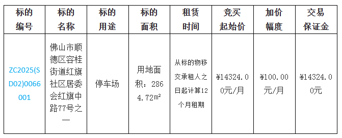 出租方采用网上竞价方式出租位于佛山市顺德区容桂街道红旗社区居委会红旗中路77号之一租赁权竞投,欢迎符合资格的竞买人参与竞价。