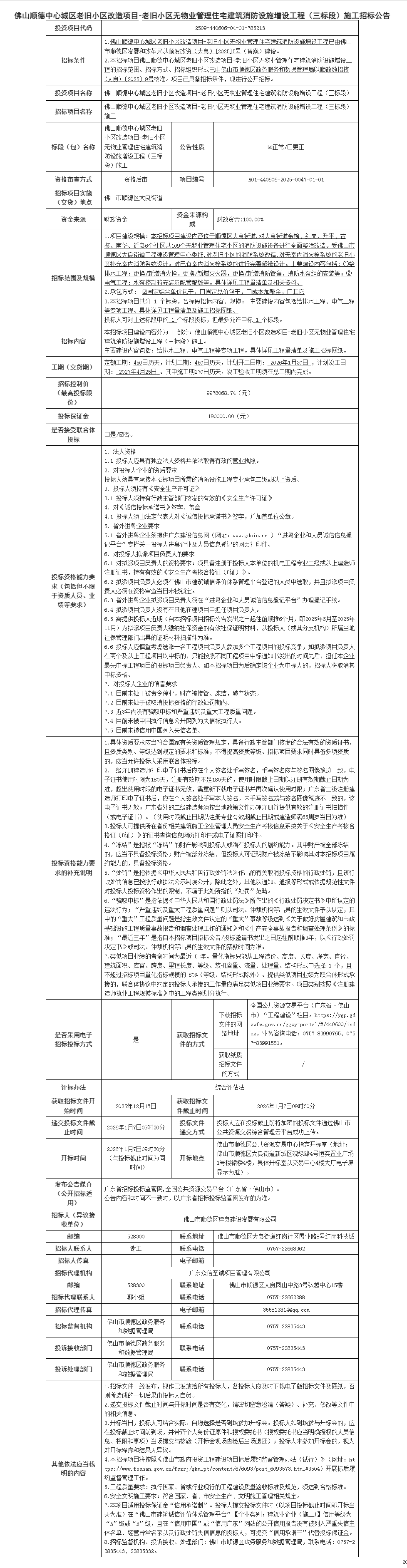 佛山顺德中心城区老旧小区改造项目-老旧小区无物业管理住宅建筑消防设施增设工程(三标段)施工招标公告