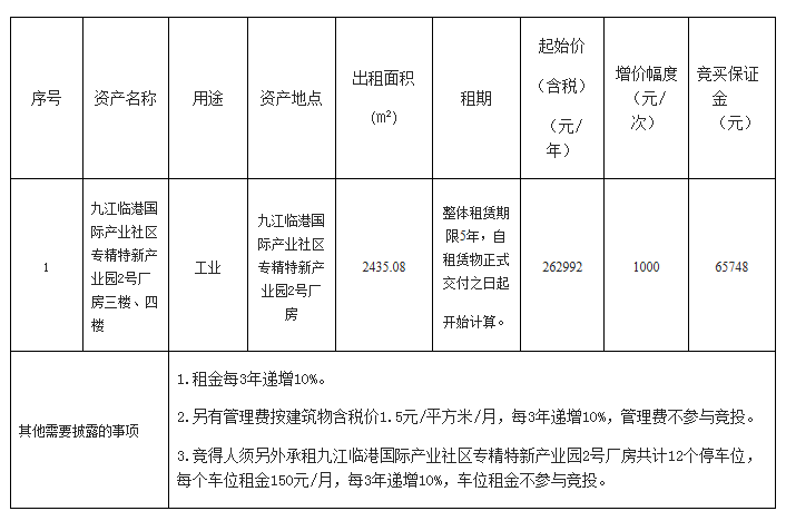 概述:竞得人须另外承租九江临港国际产业社区专精特新产业园2号厂房共计12个停车位,每个车位租金150元/月,每3年递增10%,车位租金不参与竞投。......