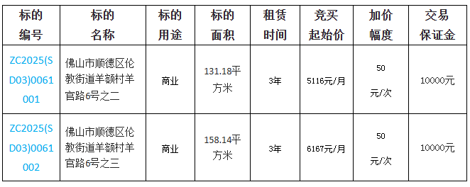 1.项目名称:佛山市顺德区伦教街道羊额村羊官路6号之二等2宗公有物业公开招租项目