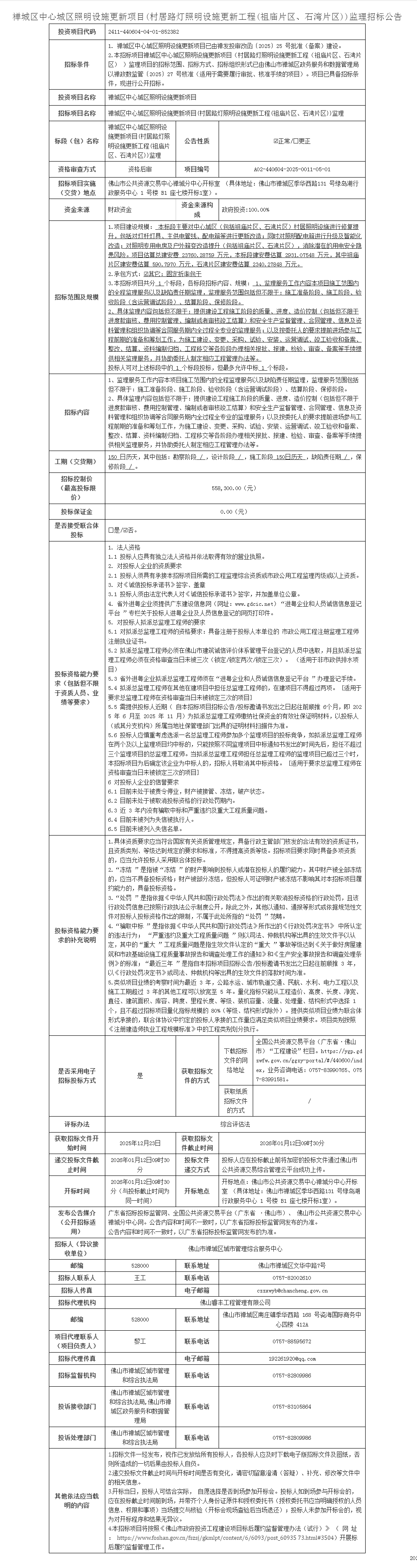禅城区中心城区照明设施更新项目(村居路灯照明设施更新工程(祖庙片区、石湾片区))监理招标公告