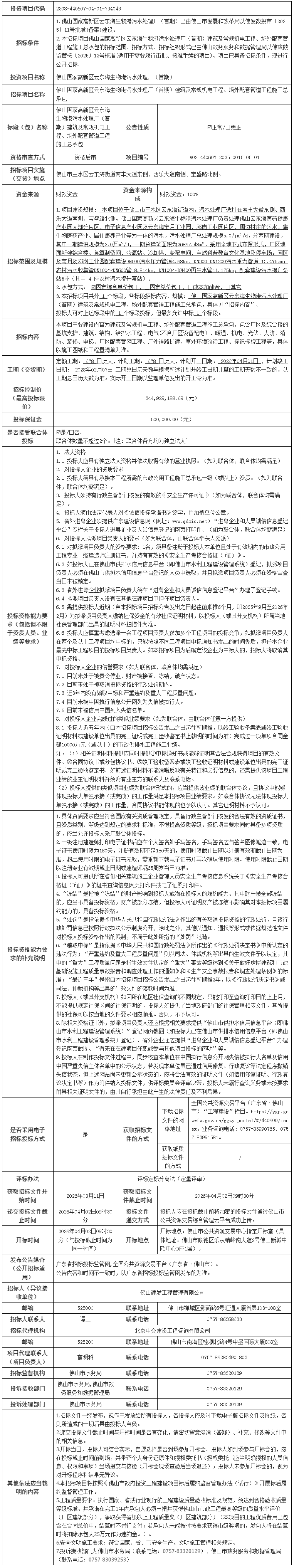 佛山国家高新区云东海生物港污水处理厂(首期)建筑及常规机电工程、场外配套管道工程施工总承包招标公告