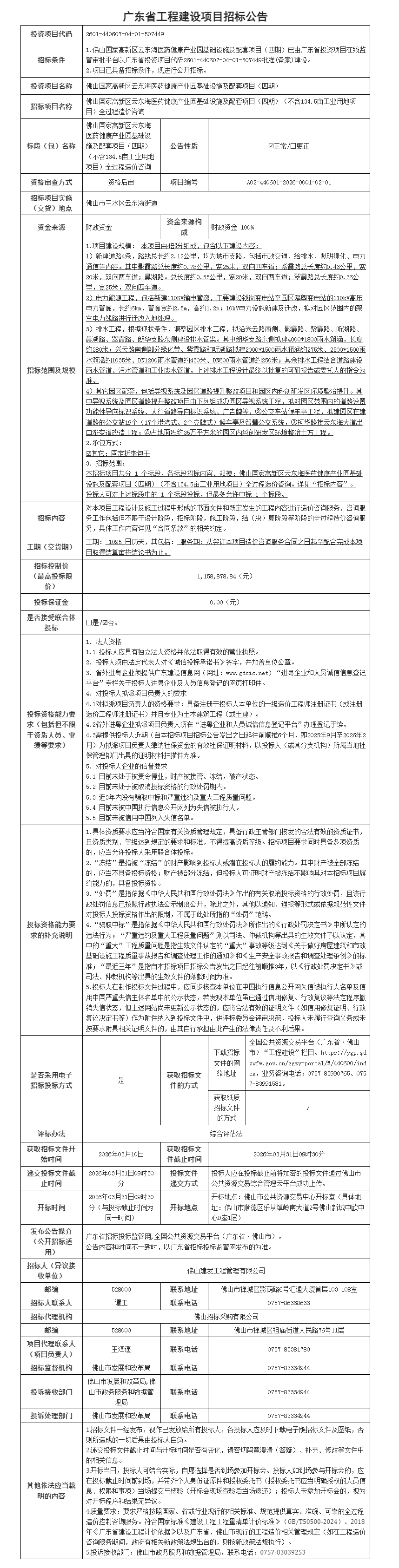 佛山国家高新区云东海医药健康产业园基础设施及配套项目(四期)(不含134.5亩工业用地项目)全过程造价咨询招标公告