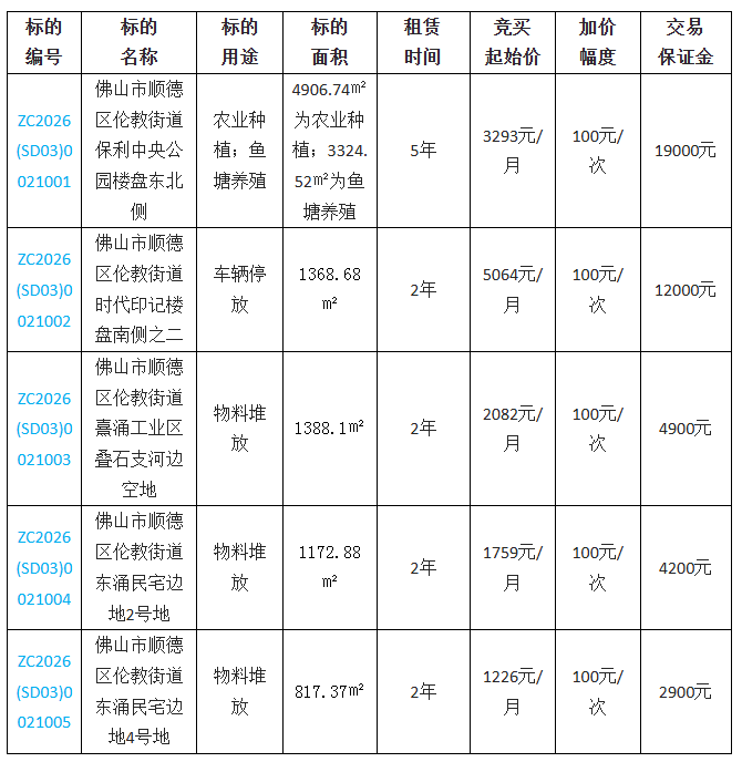 佛山市顺德区伦安物业服务有限公司采用网上竞价方式出租位于佛山市顺德区伦教街道保利中央公园楼盘东北侧等五宗地块使用权,欢迎符合资格的竞买人参与竞价。