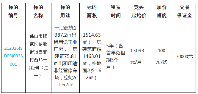 1.项目名称:佛山市顺德区伦教街道熹涌村西环一路2号(之一)公开招租项目