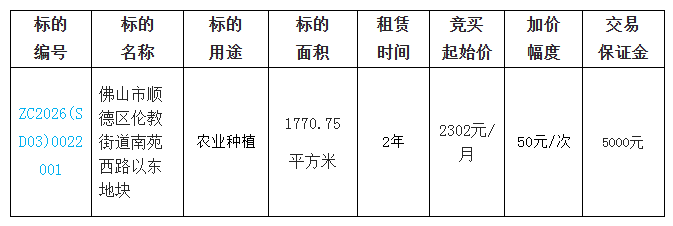 佛山市顺德区顺伦投资开发有限公司采用网上竞价方式出租位于佛山市顺德区伦教街道南苑西路以东地块使用权,欢迎符合资格的竞买人参与竞价。