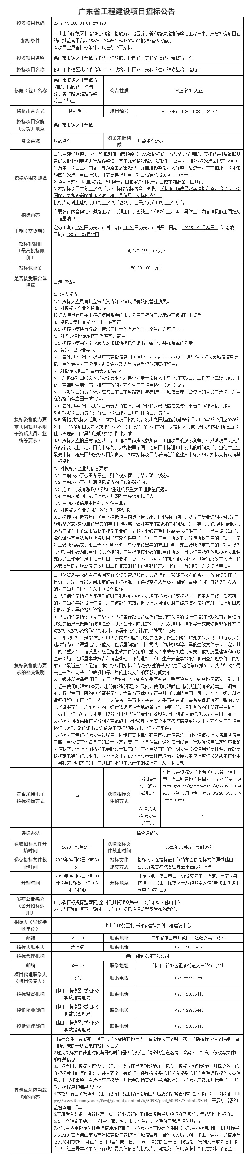 佛山市顺德区北滘镇怡和路、怡欣路、怡园路、美和路道路维修整治工程施工招标公告