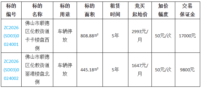 1.本项目的交易保证金为佛山市顺德区伦教街道卡卡楼盘西侧的交易保证金为人民币大写壹万柒仟元整(小写:¥17000)。佛山市顺德区伦教街道丽港楼盘北侧的交易保证金为人民币大写玖仟捌佰元整(小写:¥9800)。