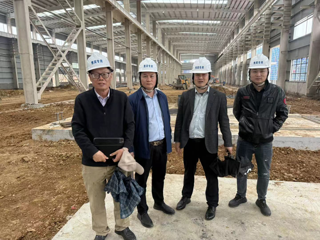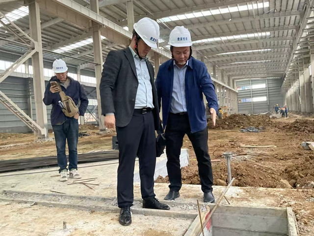 在项目现场,谭阳春总经理一行深入在建大型钢结构厂房内部,详细查看了主体结构施工、设备基础预埋、场地平整等关键工序进展,认真听取了项目负责人关于工程进度、施工计划、安全管理及投产筹备等情况的汇报,对项目前期建设成效给予肯定,并就下一步工作提出明确要求。