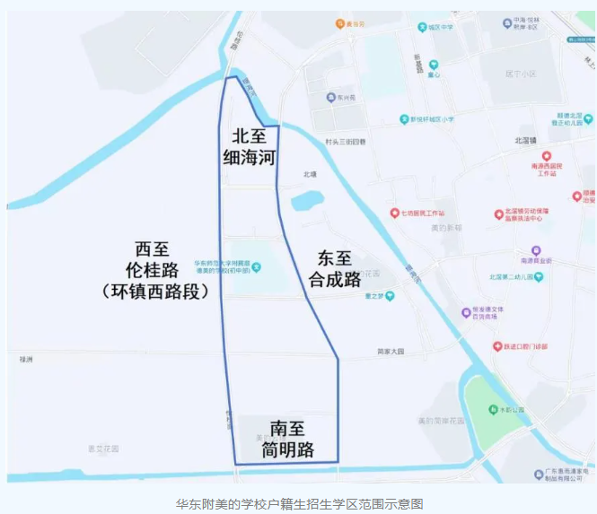 华东师范大学附属顺德美的学校(下称:华东附美的学校)小学一年级、初中一年级招录学区内户籍生(见下图)、符合有关优先安排的教育优待政策人员子女(领军人才、A卡持卡人、镇重点扶持产业人才子女)等对象后,如有剩余学位则招录北滘镇户籍生及其他符合有关教育优待政策的人员子女(B卡、C卡+副高职称、C卡+博士学位持卡人子女等);报读人数未超过剩余学位数时将全部录取;报读人数超过剩余学位数时将采取电脑随机摇号的方式录取,未摇中的适龄儿童按照志愿顺序、入户时间先后或优待对象层次类别统筹安排到有余位的公办学校。