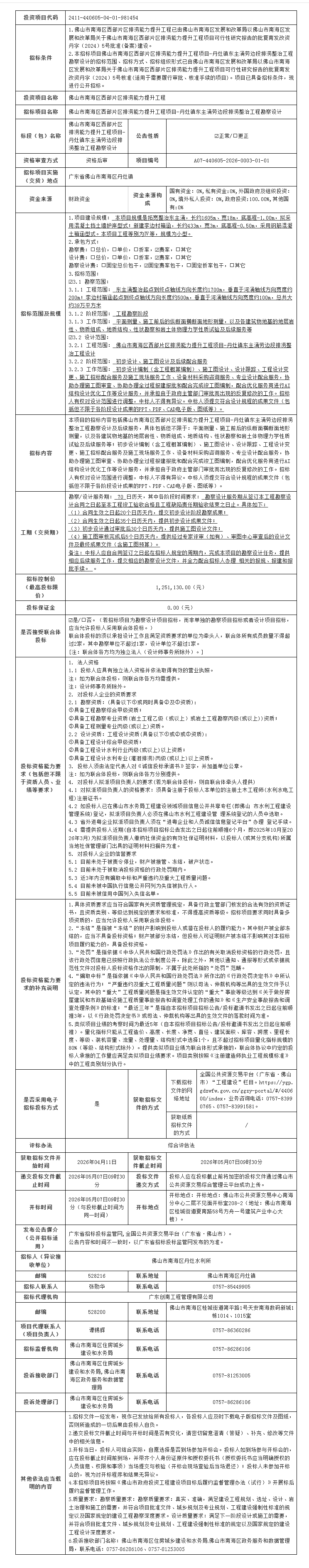佛山市南海区西部片区排涝能力提升工程项目-丹灶镇东主涌劳边段排涝整治工程勘察设计招标公告