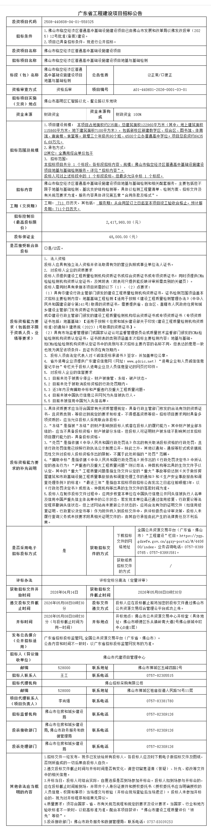 佛山市临空经济区普通高中基础设施建设项目地基与基础检测招标公告