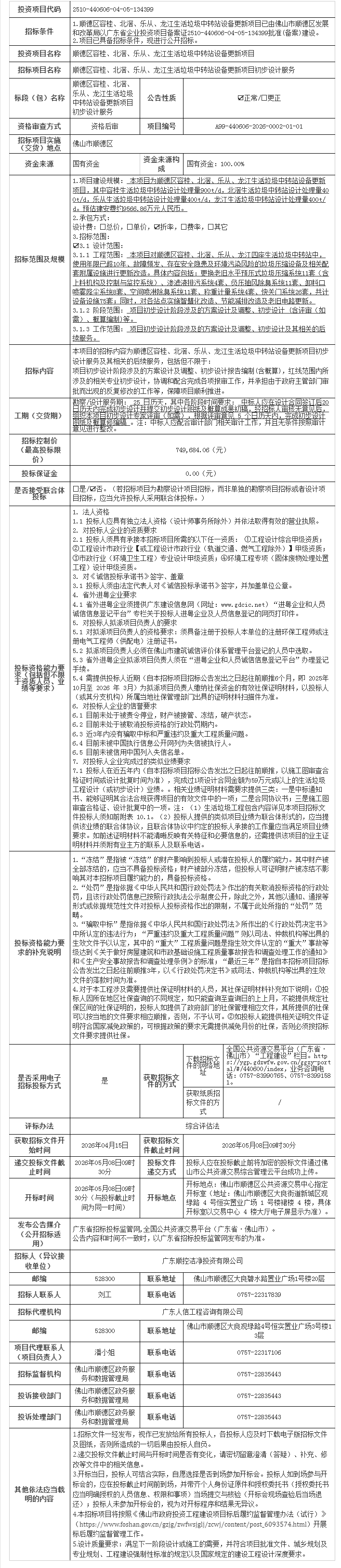 顺德区容桂、北滘、乐从、龙江生活垃圾中转站设备更新项目初步设计服务招标公告