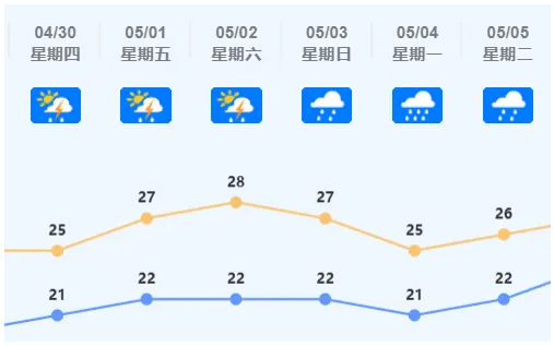 根据最新气象预测今年“五一”假期佛山以阴雨天气为主,部分时段雨势较为明显,气温在20℃~27℃之间,体感温暖舒适。