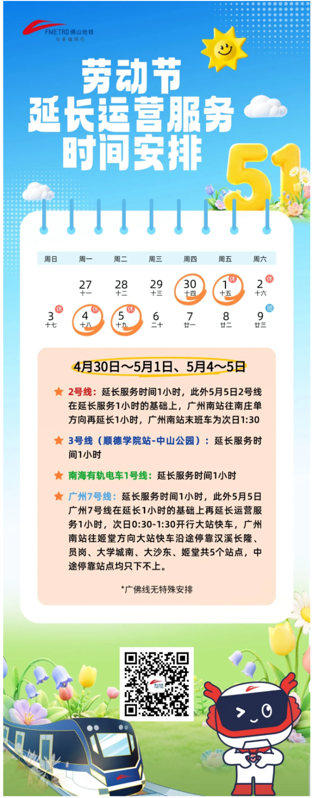 为了更好地满足“五一”假期客流需求,佛山地铁运营服务时间作出如下调整: