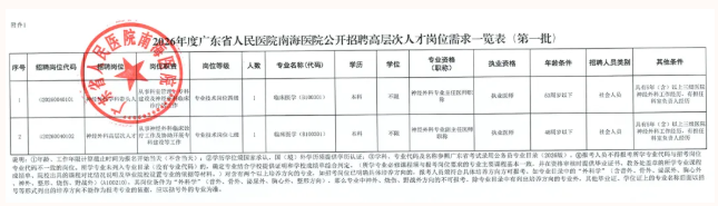 根据工作需要,广东省人民医院南海医院向社会公开招聘2名高层次人才。为确保招聘工作顺利进行,根据《广东省事业单位公开招聘人员办法》(粤府令第301号)及有关文件规定,现将有关事项公告如下: