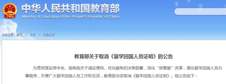 据教育部网站17日公布的消息,为简化留学回国人员办事程序,方便广大留学回国人员工作和生活,教育部决定自2020年11月1日起,取消《留学回国人员证明》。