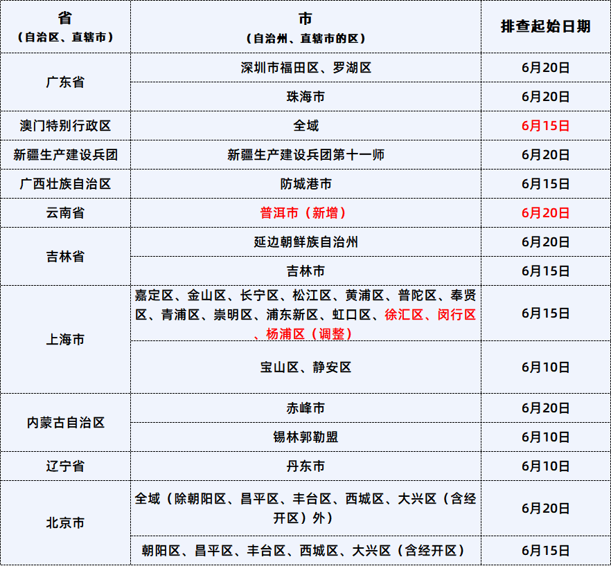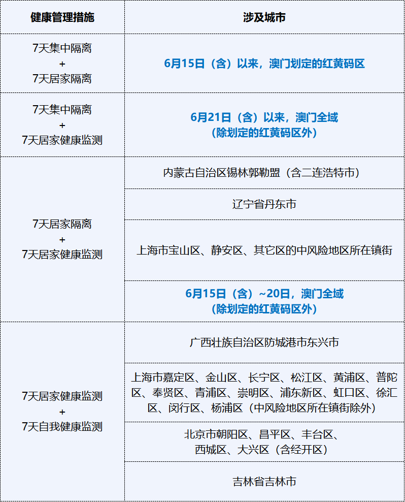 澳门特别行政区:6月15日(含)~20日,澳门全域(除划定的红黄码区外)来返佛人员