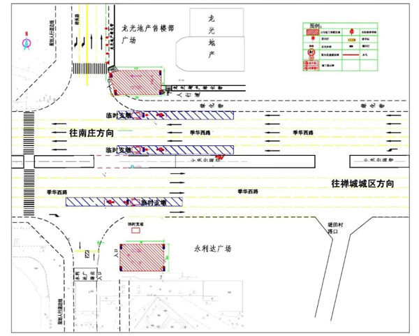 临时支墩施工:将道路禅城往南庄方向5车道调整为3车道,道路南庄往禅城方向5车道调整为4车道。