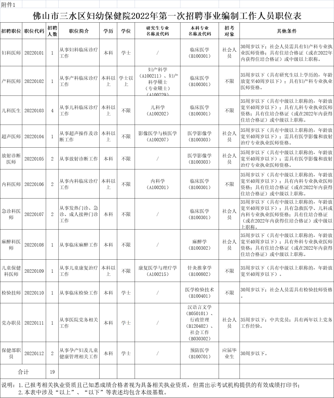 详见《佛山市三水区妇幼保健院2022年第一次招聘事业编制工作人员职位表》(见附件1)。