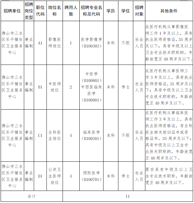 根据工作需要,三水区乐平镇社区卫生服务中心向社会公开招录11名事业单位编内工作人员,现将有关事项公告如下: