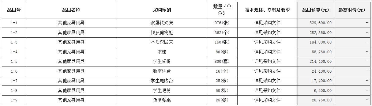 合同包1(翁祐中学宿舍、综合楼、饭堂家具采购项目):