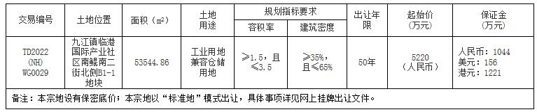 五、本宗地的公告期自2022年6月28日至2022年7月17日止;网上报价期限为2022年7月18日8时30分至2022年7月28日11时止。竞买保证金须于2022年7月26日17时之前到达本中心指定账户后,方可参加竞买。上述时间均以网上交易系统的服务器时间为准。