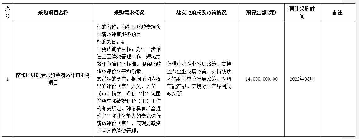 佛山市南海区财政局2022年06月至2022年08月政府采购意向