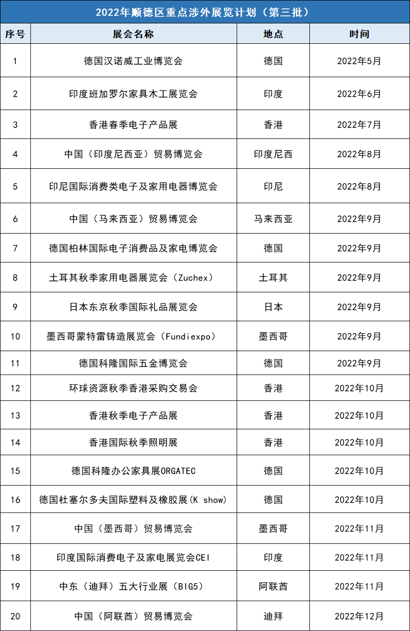为鼓励企业积极参与国际市场竞争,促进对外贸易高质量发展,宣传顺德制造外贸区域品牌形象,根据顺德区产业特色、市场布局和企业需求,结合市级(或以上)商务部门、国家级行业商(协)会相关重点项目,顺德区经济促进局编制了2022年顺德区重点涉外展览计划(第三批),参加重点计划内相关展会的企业,如符合条件,可申请相关资金。